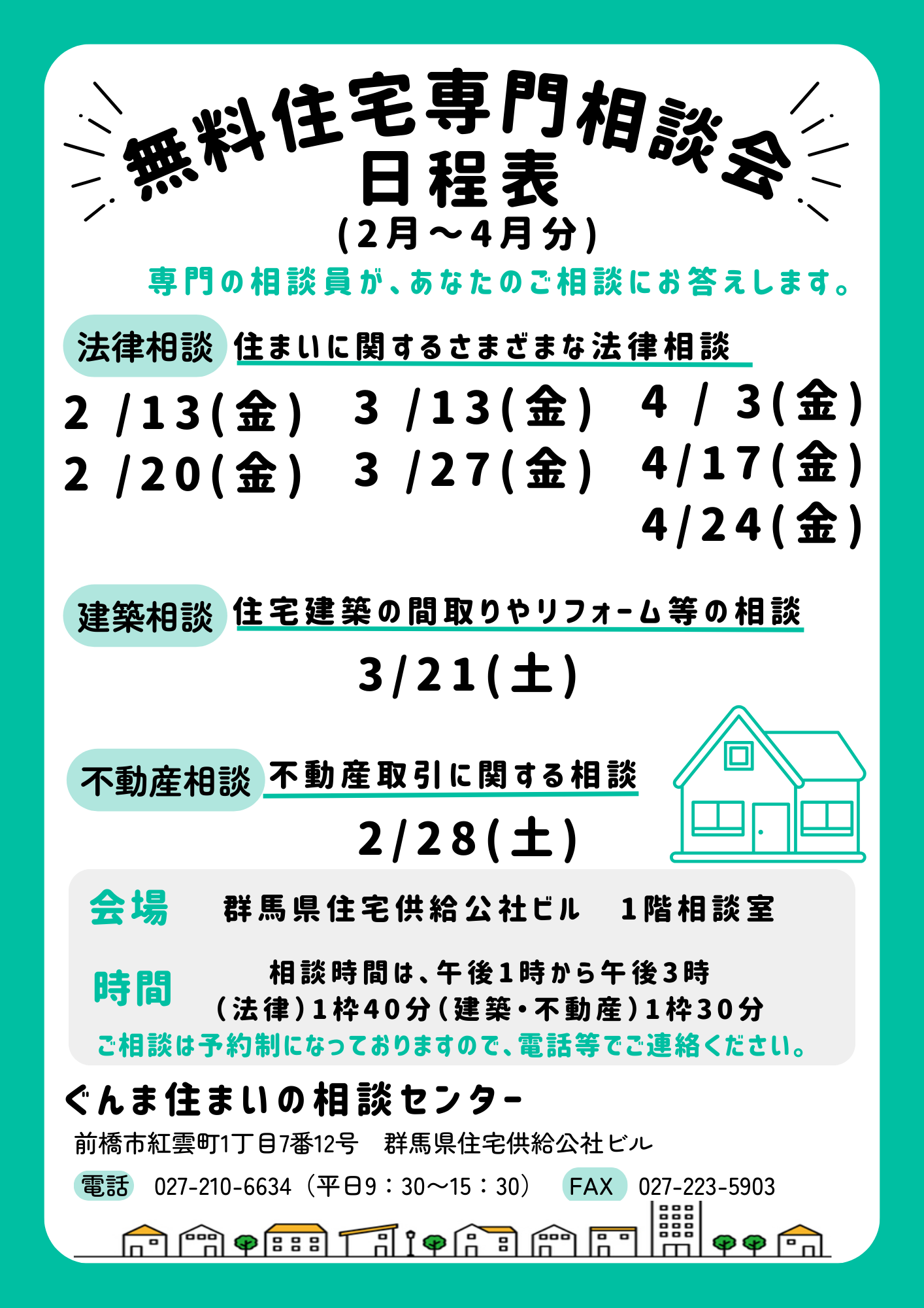 お知らせ Category >すべてのカテゴリー賃貸店舗・事務所ぐんま住まいの相談センター入札情報県営住宅公社賃貸住宅市営・町営住宅未分類現在お住まいの方へ空き家情報群馬県住宅供給公社重要なお知らせ Archives > すべて 2026年2月 2026年1月 2025年12月 2025年10月 2025年3月 2025年2月 2023年8月 2023年1月 2022年12月 2020年6月 2020年4月 2026.01.30 ぐんま住まいの相談センター重要なお知らせ 令和7年度無料住宅専門相談会 2月~4月の専門相談会の日程です。予約制となっておりますのでお電話等でお問い合わせください。 ※法律相談を受けられる方へ ※ZOOMオンライン相談 ★専門相談お知らせ 前の記事次の記事 一覧に戻る