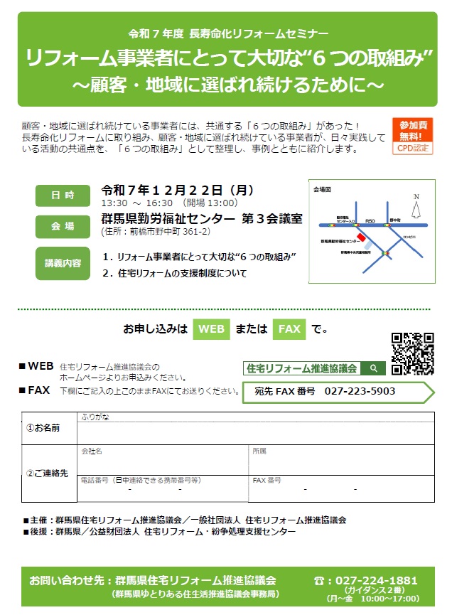 令和7年度 事業者向け「長寿命化リフォームセミナー」を開催いたします。